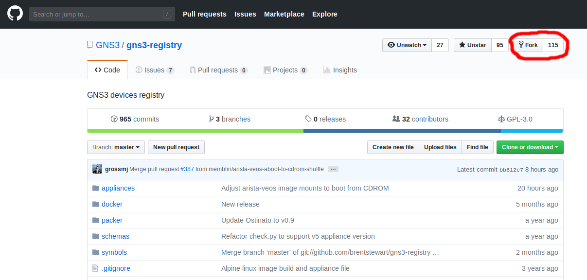 Go to the gns3-registry repository and press the “Fork” button. This creates a copy of the repo under your user: <your-username>/gns3-registry (in my case, it’s adosztal/gns3-registry).