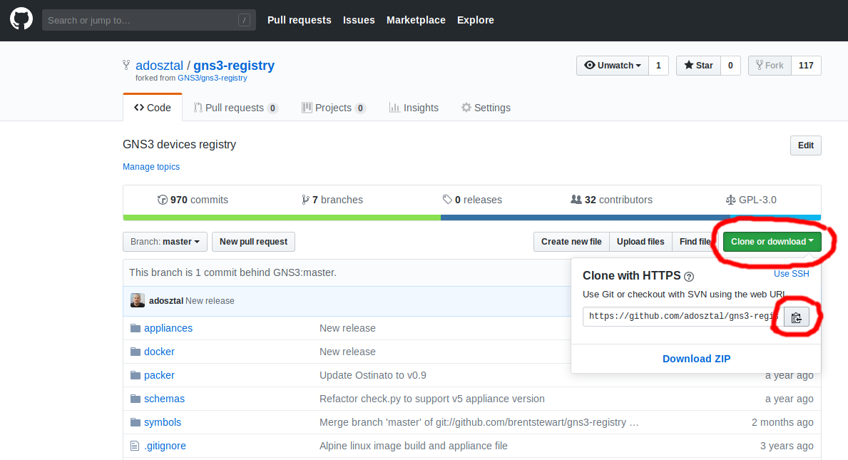 Go to your gns3-registry repository, click on “Clone or download”, then on the button right to the URL, as shown below: