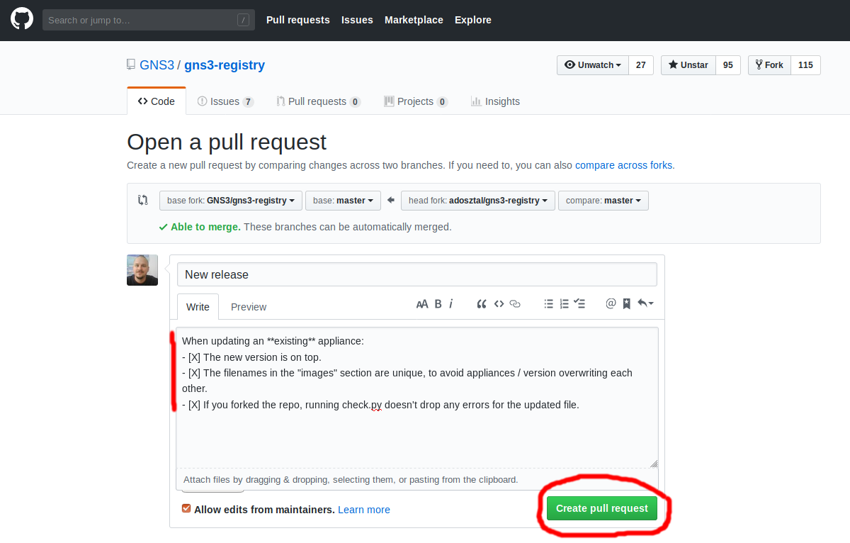 Fill in the appropriate section (i.e. updated vs. new appliance), then click on “Create pull request”.