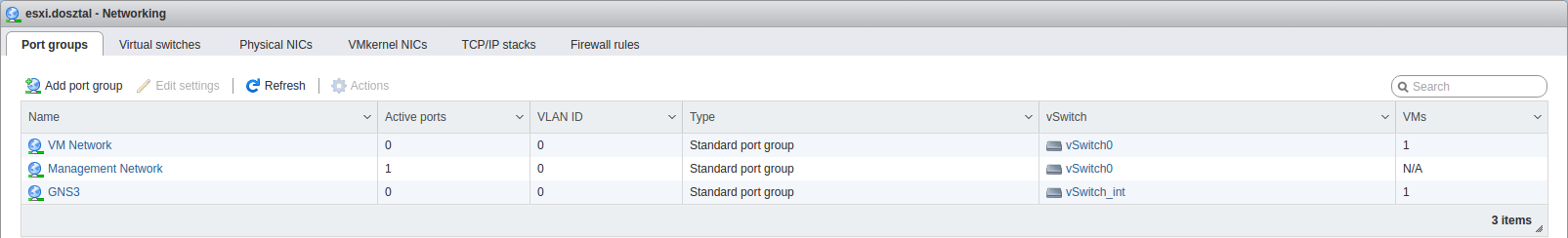 To solve this problem, we’ll place a Windows terminal server on the same ESXi host where the GNS3 VM will be hosted, and connect the two using a dedicated vSwitch and port group: